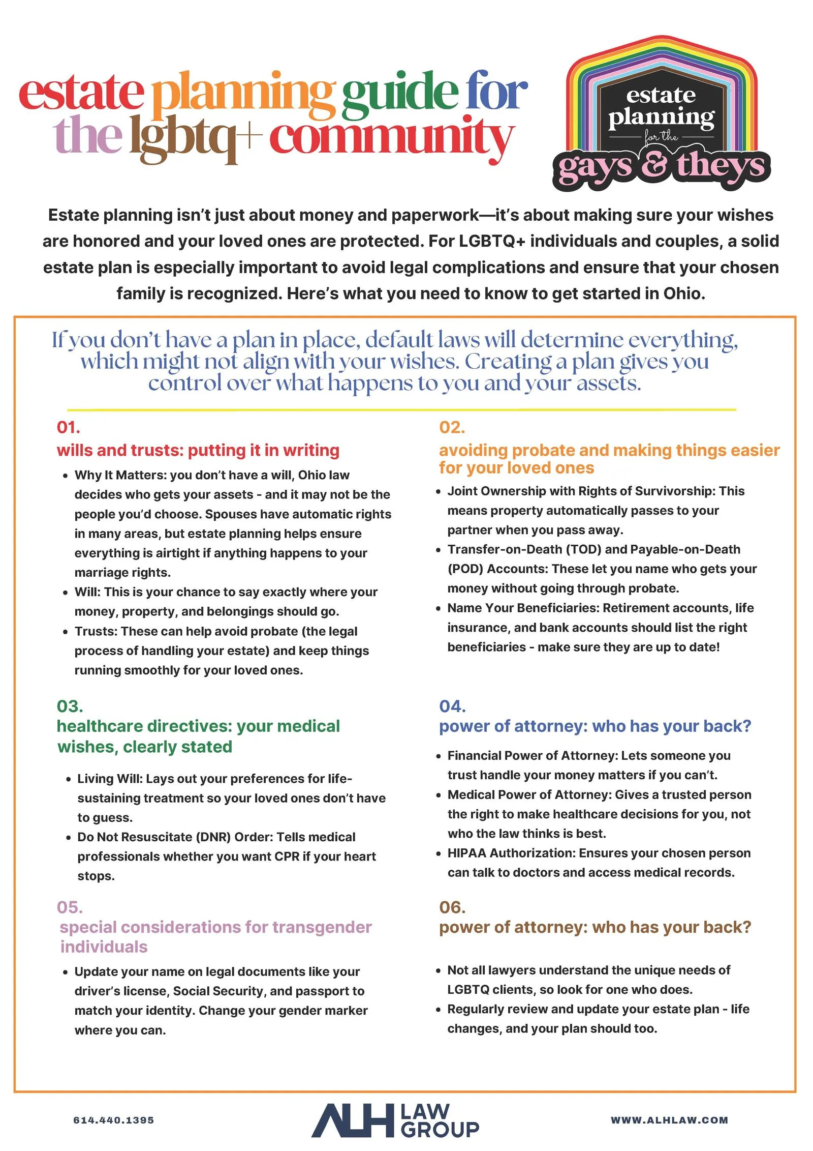 A comprehensive infographic outlining essential estate planning steps for LGBTQ+ individuals and couples in Ohio, covering wills, trusts, healthcare directives, and key legal protections.
